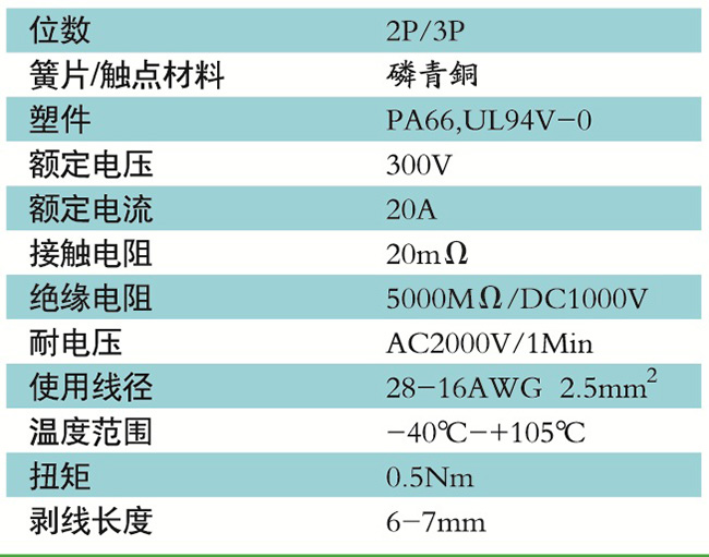 接線端子的絕緣材料用改性的尼龍(PA66),能達到或超過IEC947-7-1及EN60947-7-1標準,阻燃等級達到UL94,V-0具有良好的電氣性能和機械性能。螺絲用高強度的鋼制成鍍鋅或鎳處理,導電體四方針用合金銅制成表面鍍錫,壓片采用彈性及極強的磷青銅表面鍍錫或鎳;壓線框用抗應力裂縫腐蝕的合金銅制成,這些金屬表面還鍍錫或鍍鎳加以保護。設計完全符合IEC60947-7-1.GB14048.7等標準。
